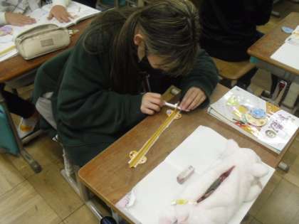 算数科「円と正多角形」の学習では、円周は直径の何倍になっているのかを、教科書に付いている「円周測定マシーン」を使って調べました。直径のおよそ3倍だと分かっていましたが、詳しく調べると3.14倍になっていることに気付き、この数を円周率ということを知りました。学習が終わってからは「3.141592、、、」と円周率を唱えるなど、学習したことに興味も持っていました。