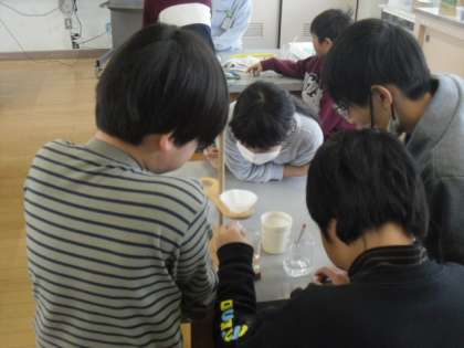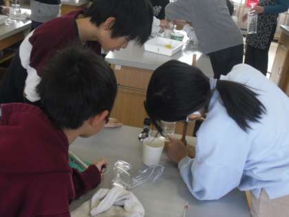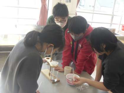 理科「もののとけ方」の学習では、水溶液を冷やすと、ものの溶け方はどのように変わるのかを考えました。前回、温めてものの溶け方が変わったことを踏まえて、予想し、実験しました。水温を注視しながら実験していました。