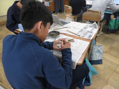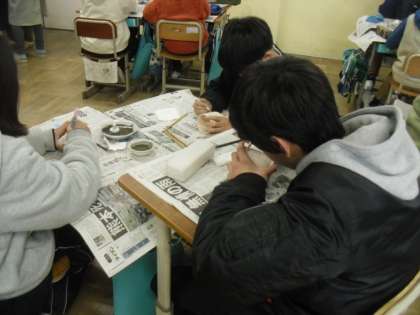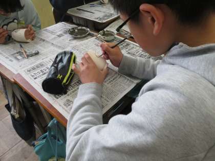 今日は清水焼の絵付け体験をしました。初めにゲストティーチャーの方が絵を描いて見本を見せてくださったときは簡単そうに見えましたが、実際にやってみると線をかくのは手が震え、筆を使うのは思ったよりも難しかったです。振り返りでは、「筆で細かく描ける職人の技はすごいと思った。」、「できあがった作品が焼いたらどんな色になるか楽しみ。」、「自分のオリジナルの作品ができてうれしい。」などと発表していました。