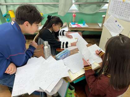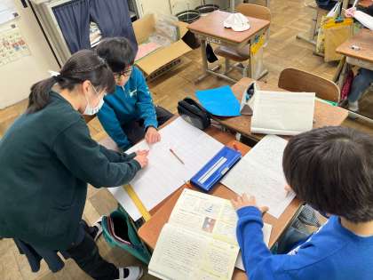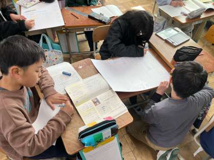 国語科「調べて話そう、生活調査隊」で、ポスター作りと原稿を書きました。各グループでどうすれば見やすいポスターができるのか話し合ったり、どうすれば伝えたいことがうまく伝わるのかを考えたりして、協力して取り組んでいました。