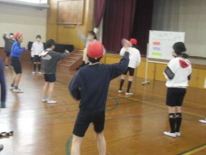 体育科「リズムダンス」の学習では、いろいろな音楽にのって、体を動かしました。「のり」が大切であることを伝えると、拍などに合わせてノリノリで踊っていました。この学習をもとに、6年生を送る会では、ある曲で6年生を送り出そうと計画しています。