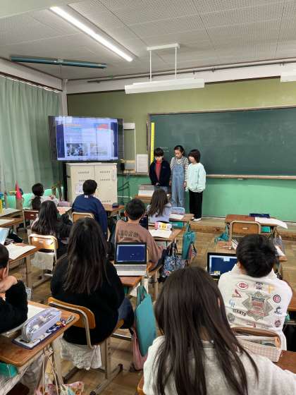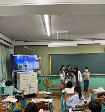 社会科「国際交流のさかんな舞鶴市」の学習で、ロシアのナホトカ市、イギリスのポーツマス市、中国の大連市が舞鶴市とどのように交流しているのか調べ、発表しました。