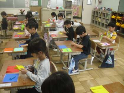 はさみをつかっていろいろな形をつくりました。はさみの持ち方や姿勢、切り方に気を付けて取り組みました。みんなのかざりがあつまると、とても楽しい気持ちになりました。