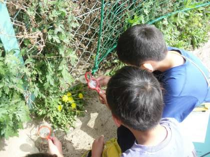 運動場や花壇の生き物探しをしました。詳しく観察したい生き物を決めて、虫めがねを使って観察しました。