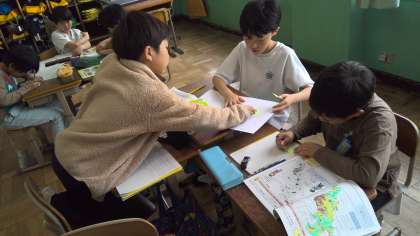社会科「京都府の様子」の学習では学習のまとめをしました。これまで学習した京都府の地形や人口分布、特産物などを思い出しながらみんなで話し合ってまとめることができました。