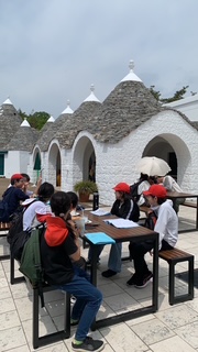 昼食をとっている子どもたちもいます。ピザやパスタ、ジェラートを食べています。