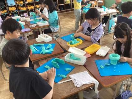 図画工作科「ねん土の板を立ち上げて」の学習では、粘土の板を工夫して立ち上げ、そこから自分がいいと思う形に飾りや模様をつけていきました。それぞれこれまで学習してきたことを生かして作品を作っていました。