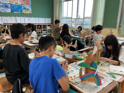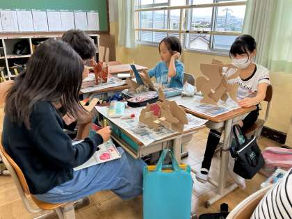 今日は今まで糸のこで切っていた板を組み立てたり、色を塗ったりして作品を仕上げる活動をしました。「この板、オオカミに見える!」と周りの子に伝えると「おおー!」、「確かに!」ととても盛り上がる様子や、何が表せるか悩んでいるとアドバイスする姿が見られました。思いのままに切った形から素敵な作品ができあがってきました!