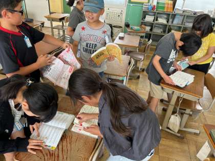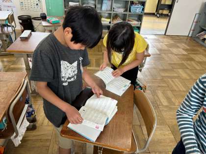 外で遊ぶことができない休み時間。何やら盛り上がっている子どもたちの声が聞こえてきました。なんとそこで行われていたのは、漢字辞典を使って誰が一番に漢字を探せるかのゲームでした。学習したことを使って楽しく遊ぶ姿はとても素敵でした!