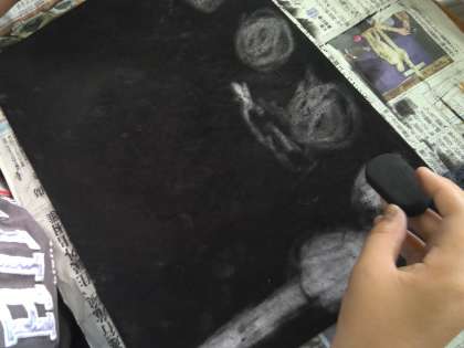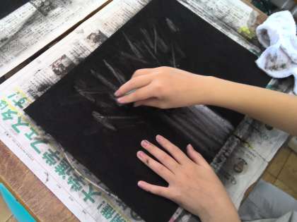 今日は「消してかく」でコンテで真っ黒にしておいた画用紙を消しゴムで消して白い跡で作品を作りました。普段の絵の具を使う学習と違い、「こうしたかった。」と思ったらもう一度コンテを使って黒くぬり、やり直すことができます。手を真っ黒にしながら、お互いの作品を見合って声をかけあう姿が見られました。