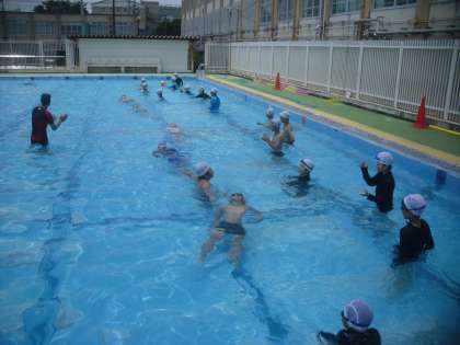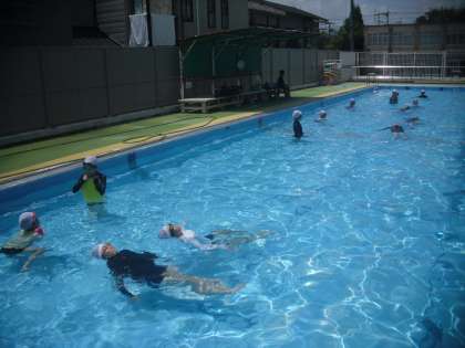 体育科「水泳運動」の学習では、水難事故に備えた「安全に関する運動」も行います。いざというときに備えて、学習の始めに『浮く』練習しています。自分の命を守ることができるような力も身に付けてほしいと思います。