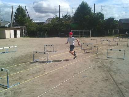 ハードル走では、40mの距離に4台のハードルを設置して取り組んでいます。インターバルやインターバル間の歩数を変えるなどして、自分に合った走りができるように考えながら活動しています。