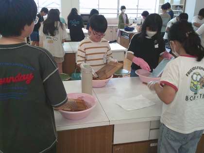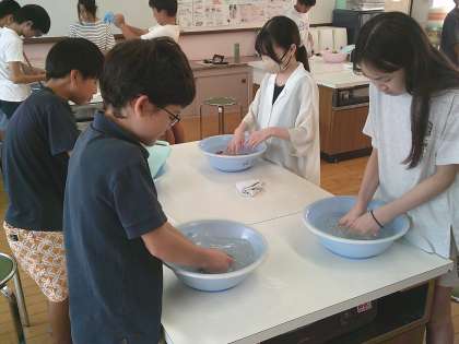 家庭科「夏をすずしくさわやかに」の学習では、暑い夏を快適に過ごすために、住まいや衣服の工夫について考えています。夏の衣服の着方について考えるとともに、その手入れの仕方についても学習しました。今回は手入れの仕方の一つとして、「手洗いでの洗濯」を実習しました。靴下を洗濯し、汚れが落ちていく様子や洗濯の大変さを知ることができました。「つまみ洗いをしたら細かい汚れも落とすことができた。」と思うように汚れを落とすことができた子や、「手洗いだとこんなに大変なのか。洗濯機は便利すぎる。」と汚れを落とすのに一苦労した子など、子どもたちの様子は様々でした。