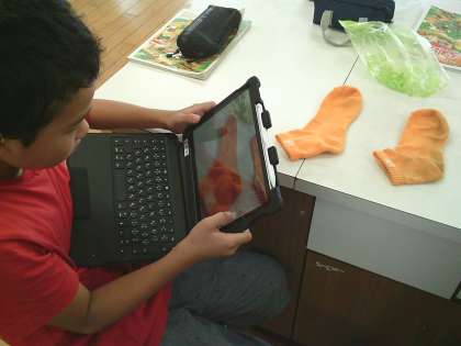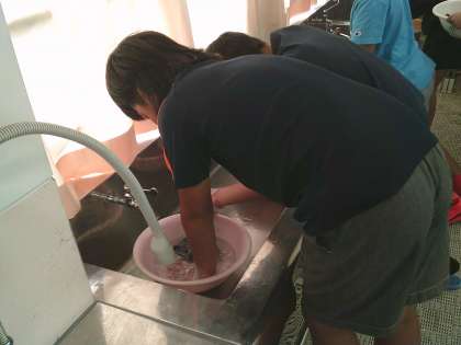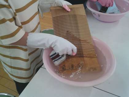洗濯板を使って洗った子もいます。また、しっかり「すすぎ」までしていました。後日、洗った靴下と洗っていない靴下を比べると、その違いに驚いていました。
