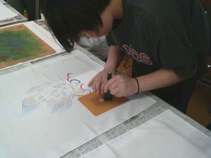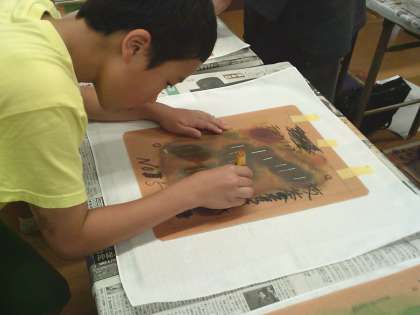 今回は「京友禅」の先生をお招きして、「京友禅」の中の「型染」を体験させていただきました。事前に子どもたちが選んだ柄の型や、このために彫っていただいた子どもたちの名前の型などを使って、自分だけのハンカチに染め上げました。子どもたちは、出来上がっていくハンカチを見て、非常に喜んでいました。