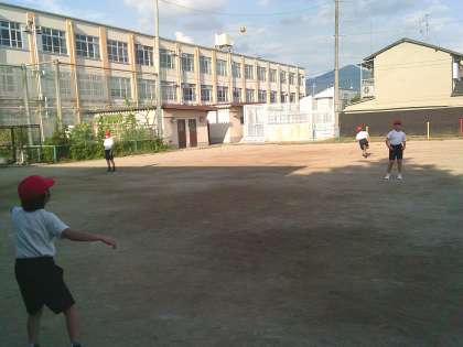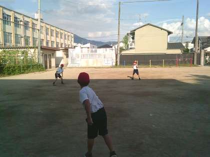 16日(火)の活動では、「ソフトボール投げ」をしました。残り遊びができる時間までは、丸めた新聞紙で、フォームを確認しました。残り遊びが終わって計測すると、4月よりも記録の伸びた子どもたちもいました。