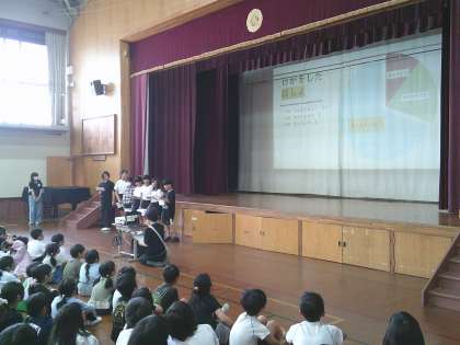 また、児童集会では、代表委員・保健委員・運動委員の子どもたちが学校がよりよくなるように、それぞれ発表しました。保健委員の子どもたちは、本校で多い怪我の種類や原因、処置の仕方などを紹介してくれました。