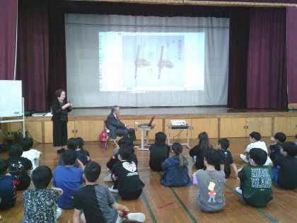 8日(水)に、子どもたちに京都の文化・芸術をもっと身近に感じてもらう取組「ようこそアーティスト」で、書道体験をしました。今回、白井進先生、堂本東頓先生、さらに3人の先生にお越しいただき、書道の歴史や書の書き方などを教えていただきました。 隷書や篆書、草書、行書などの字に挑戦したり、大きな半紙や色紙に書いたり、普段書き馴染みのない字や物に触れ、書道を楽しんでいました。