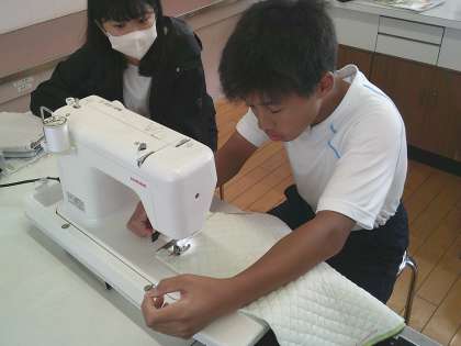 ナップザックやトートバックの制作に取り組んでいます。安全に気を付けながら、ミシンやアイロンも使っています。