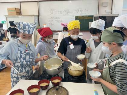 2組では今日、調理実習で「ごはん」と「みそ汁」を作りました。おうちでは炊飯器を使ってごはんを炊く家庭も多いですが、今日は鍋を使って炊きました。おこげもできてとてもおいしかったようです。みそ汁は大根や油揚げを具材にしました。切る時は怪我をしないように気を付けている様子が見られました。寒くなってきたのでみそ汁はあたたかくとてもおいしかったです。