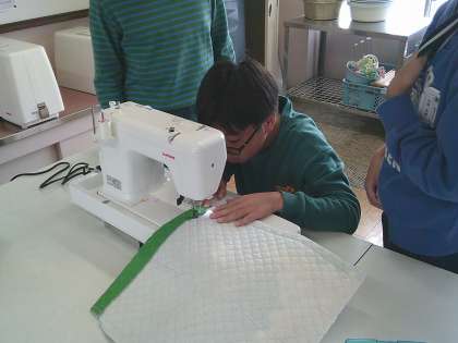 トートバックやナップザックが出来上がってきています。丈夫になるように返しぬいをしたり、口開き部分をかがりぬいしたり、丁寧に仕上げています。