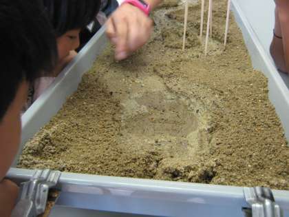 理科で,流れる水のはたらきを学習しています。流れる水の様子を,川の模型を作って観察しました。すると,カーブの内側と外側で違いが見られました。内側は流れが遅く土砂がたまりました。逆に,外側は流れが速いため削られる様子が観察できました。これは,実際の川でも同じことがいえることが,川の写真から確認できました。自分たちの目でちがいを確認でき,よい学習になりました。