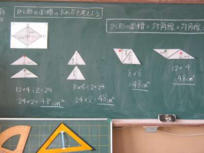 三角形や平行四辺形,台形,ひし形などいろいろな形の面積の求め方を考えてきました。これまで学習してきたことをどのように生かしたら面積が求められるのか,実際に切って形を組み替えたりして考えました。みんなの発表を聞いていると,色々なアイデアが出てきて感心させられます。自分が思いつかなかったアイデアを聞くと,思わず「なるほど」「あっ,そうか」というつぶやきが聞こえてきます。公式を覚えるだけでなく,なぜそんな公式になったのかを大切にして,これからも学習していきたいです。