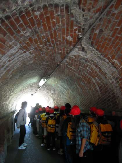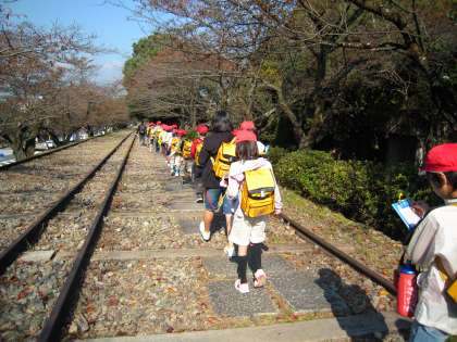 地下鉄の蹴上駅をでて,少し歩くと「ねじりまんぽ」がありました。その不思議な形にも昔の人の知恵が使われていました。そして,琵琶湖疏水記念館まで,途中大きな台車を見ながらインクラインの上を歩きました。とてもよいお天気で,長く続くインクラインでしたがみんなとても元気よく歩いていました。