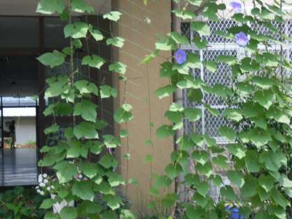 本館前のみどりのカーテンが育ってきています。紫色が混じった淡いブルーの朝顔の花が咲いています。少しでも涼を感じることができるといいですね