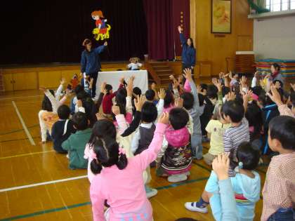 犬の劇を見ながら,盲導犬や介助犬,聴導犬について仕事などを教えていただきました。スーパーやレストランにも入れると聞いて,驚きの声をあげる子どもたち。「犬のおまわりさん」「ドラえもん」の歌が,手話でできるようにもなりました。おうちの人にもぜひ教えてあげたいね!とはりきっていました。