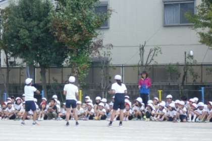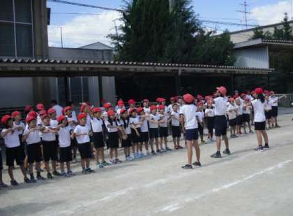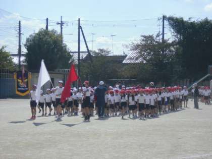 全校練習の2回目を行いました。開会式の入場行進と赤組・白組の応援風景です。応援団のリードのもと,両組とも大きな声で応援しています。