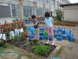 ジャガイモ,大豆,プチトマト,キュウリ,つるなしインゲン,ナス,と,いろいろ育てている3組ですがそれぞれかなり大きくなってきました。毎朝,3人で「大きく名あれ!」とお水をあげています。