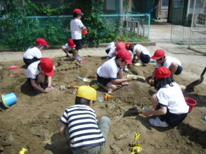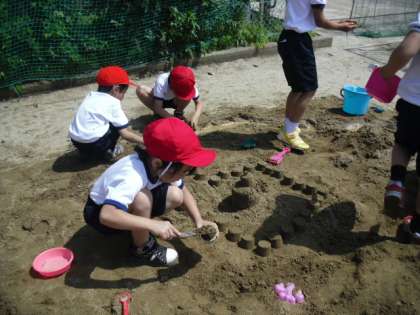 1年生が砂場で,図工の「すなやつちとなかよし」の活動をしています。砂や土の感触を味わいながらケーキを作ったり,川を作ったりして,造形活動を楽しんでいました。お天気も良く気持ちの良い活動になりました。