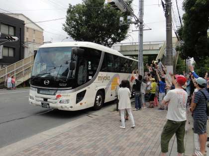 昨日の雨もすっかりとやみ,運動場で出発式を行い,多くの保護者の方々に見送って頂き,元気に「みさきの家」に向け出発しました。