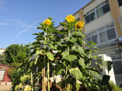 ラジオ体操8日目。今朝も気持ちの良い青空が広がり,早朝より,体育振興会・PTA本部の皆様・地域委員の皆様にお世話になり,運動場で行いました。学校園のヒマワリも2mを超える大きさに育ち,大輪の花を咲かせています。