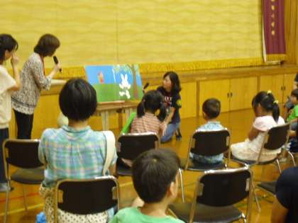 その後、体育館では読み聞かせと輪投げが始まりました。子どもたちはすぐに行列を作っていました。いろいろな催しがたくさんあって,暑さも忘れて楽しんでいます。