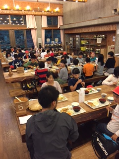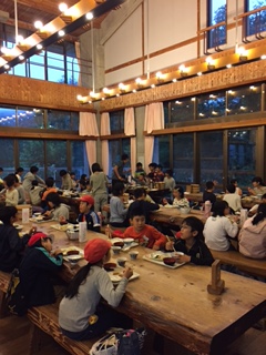 山の家での暮らしも2日目になり,すっかり慣れてきました。3校で楽しく過ごしたオリエンテーリングの後は,お風呂で汗を流しすっきりしました。そして,夕食の時間です。楽しかったオリエンテーリングの話やこの後のキャンドルファイヤーの話で,和やかな食事の時間となりました。
