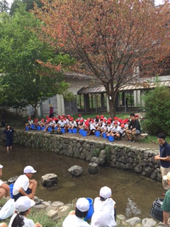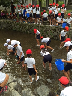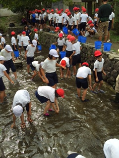山からの澄んだ冷たい水の中を元気よく魚が逃げ回ります。みんなで追い込んでも足元をするりと抜けて行き,なかなかつかまりません。苦労して捕まえた魚は,この後自分でさばいて,炭火で焼いていただきます。