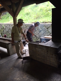 苦労して手づかみでとった魚を今度は自分でさばきます。所員の方からの説明を聞き,魚の内臓を取り,串にさします。次は塩焼きです。地域からボランティアの方に炭火の準備をしていただきました。
