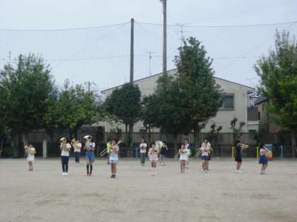 金管バンドクラブが,朝練習をしています。4月から始めた3年生も多いのですが,だんだん大きな音が出るようになってきています。運動会の開会式の後で,披露しますのでぜひ足をお運びいただき,応援をよろしくお願いします。