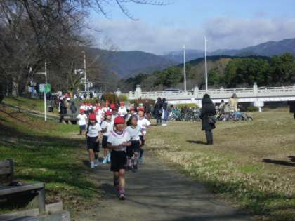 賀茂川河川敷の北大路〜出雲路橋周回コースで,マラソン大会を行いました。まずは6年生が一斉にスタート。1分毎に,5年生から1年生,3組まで順番に笑顔で張り切って走り出しました。ピリッと寒い空気もワクワクして走る子ども達には,かえって気持ちが良いようです。