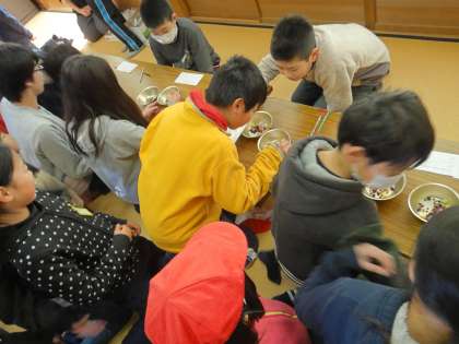 本日の中間休みに「豆つまみ大会」を行いました。たてわりグループごとにチームを作り,食器に入れた豆をとなりに置いた食器に移します。小さくて滑る豆をお箸の先で慎重につまみます。時間が来たら次の人に交代,みんなあわてる気持ちを抑えて,ドキドキしながら豆をつまみました。グループで仲よく楽しい時間を過ごしました。