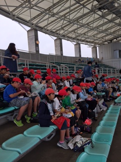 名古屋港水族館に到着です。,お楽しみの「イルカショー」を見学しました。イルカのジャンプには歓声が上がっていました。この後は,朝早くから作っていただいたお弁当をおいしくいただきました。