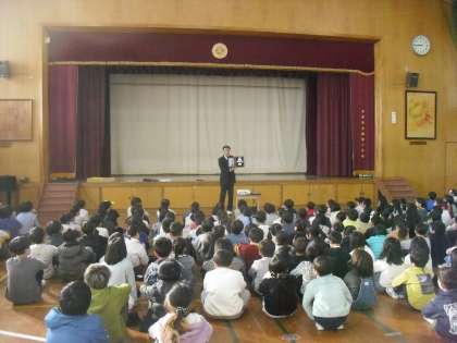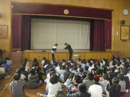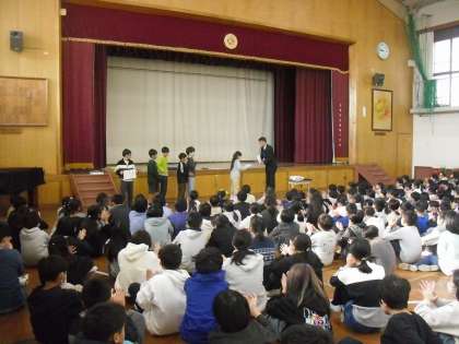 今月は「人権作文」「姉妹都市展」「京キッズRUNのメダルデザイン」で賞をいただいた子どもたちの表彰を行いました。また、鳳徳小学校の学校運営協議会が教育功労者賞を受賞し、その賞状とメダルの紹介がありました。たくさんの地域の方々に支えていただき、子どもたちが生き生きと力を発揮することができている鳳徳小学校です。多くの表彰をみんなで喜ぶことができ、あたたかい朝会になりました。