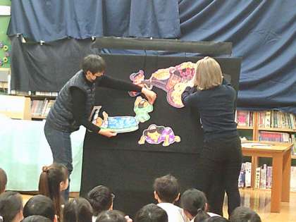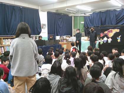 今日は図書ボランティアさんによる「ブラックパネルシアター」が行われました。今回は「じごくのそうべえ」のお話をやっていただきました。音楽や効果音も相まって作品に引き込まれ、とても楽しくお話を聞きました。終わった後には「何パーツくらいあるの?」、「どうして光るの?」、「どんな工夫をして読んでいるの?」など子どもたちの質問にも丁寧に答えていただきました。新しい作品を作るとなると1年以上かけて制作すると知り、子どもたちも驚いていました。