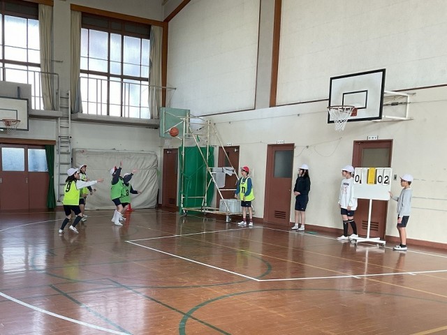 体育では今日から「バスケットボール」の学習がはじまりました。事前にアンケートをとるとルールを知らない子も多く、今日はルールを確認しながら1回目の試合を行いました。チームの友だちに「こっちマークしたほうがいいよ!」、「ナイス!」など試合に出ている人も出ていない人も、たくさん声をかけあっている姿が見られました。
