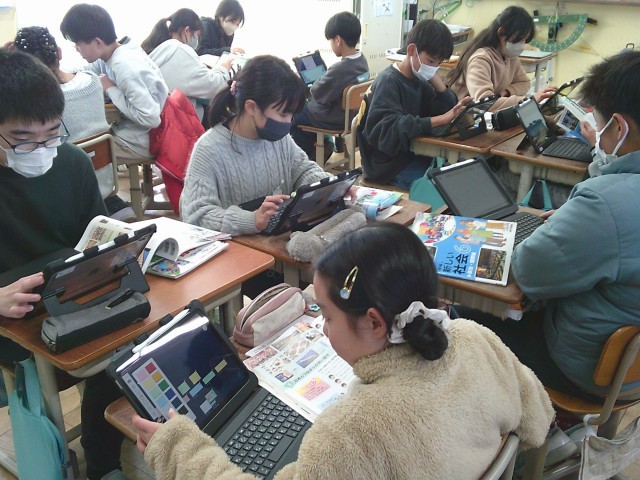 世界地図を見ながら、日本とつながりのあることを見つけ、班でまとめていきました。「食べ物や物などは世界中と交流があるな。」「アフリカなど遠いところとのつながりがなかなか見つけられなかった。」など様々な気づきがありました。