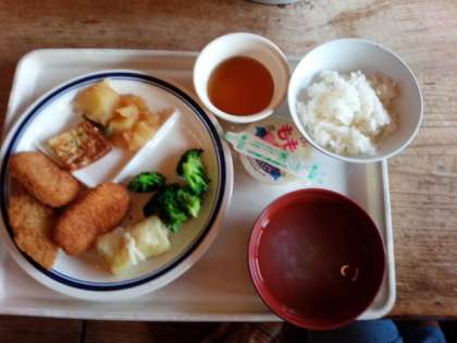 山の家の食堂の夕飯のメニューです。クリームコロッケがおいしかったです。
