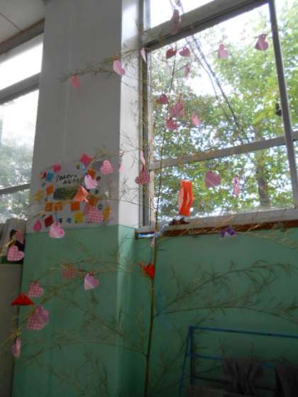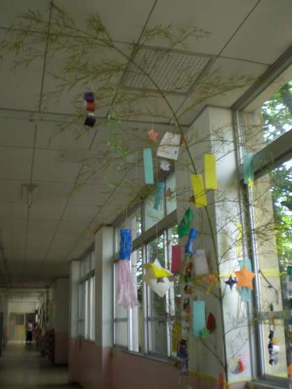 今日は,七夕の日です。紫竹小学校も,今週初めに築山の竹を切り,七夕の飾りを笹につけました。「みんなが幸せになりますように。」「あさがおがさきますように。」「ともだちがふえますように。」と心が温かくなる願い事もありました。みんなの願いがかなうといいですね。そして,今日の夜,よい天気でありますように・・・。