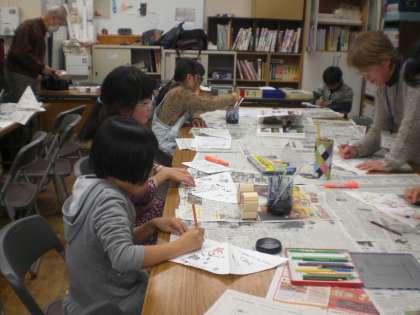 12月22日の放課後まなび教室は,平成29年の締めくくりとして,毎年恒例の「お楽しみ会」が行われました。クリスマスが近いと言うこともあり,夜美しく光る「あんどん作り」に挑戦しました。参加した子どもたちは,サンタさんや雪だるま,こたつなど思い思いの絵を和紙に描きました。ブルーやグリーン,オレンジの光に当てるととても神秘的な絵になりました。自分だけの「あんどん」が完成しました。放課後まなび教室の先生の皆様,素敵な「まなび」をありがとうございました。
